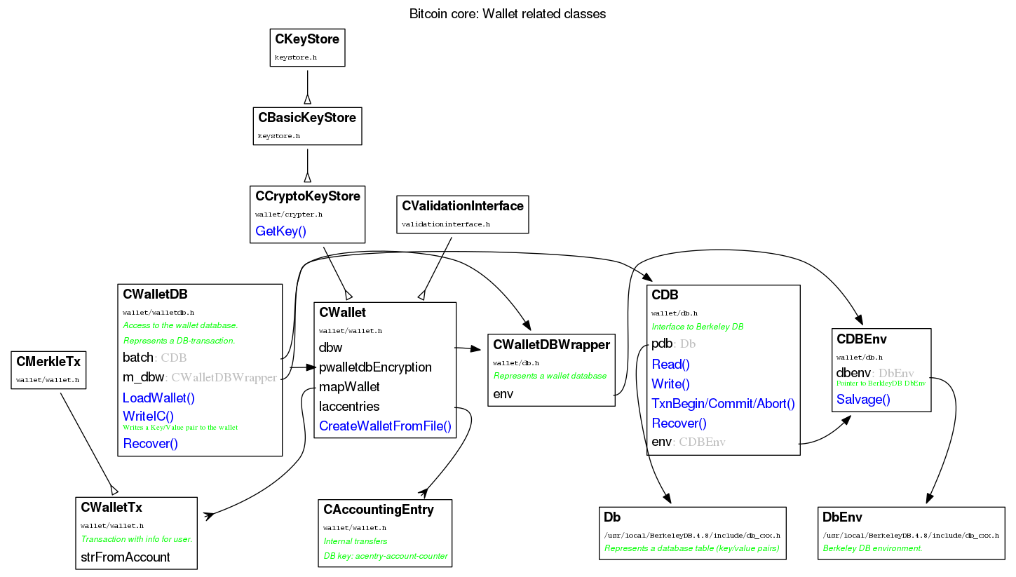 Classes shown: CKeyStore, CBasicKeyStore, CCryptoStore, CValidationInterface, CMerkleTx, CDB, CWalletDB, CWallet, CWalletDBWrapper, CDBEnv, CWalletTx, CMerkleTx, CAccountingEntry