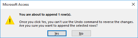 is used to execute an insert statement, by default, Access pops up a message box with a You are about to append … row(s) message: doCmd.setWarnings false