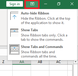 application.executeExcel4Macro "show.toolbar(""ribbon"", true )" application.executeExcel4Macro "show.toolbar(""ribbon"", false)"