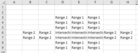 option explicit public sub main() dim range_1 as range dim range_2 as range dim range_result as range set range_1 = activeSheet.range("d3:f9") set range_2 = activeSheet.range("b6:h7") set range_result = intersect (range_1, range_2) range_1.value="Range 1" range_2.value="Range 2" range_result.value="Intersection" activeWorkbook.saved = true end sub