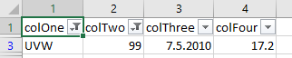 r = r + 1 : .range( .cells(r, c), .cells(r, c+3) ).value = array("UVW" , 99 , #2010-05-07#, 17.2)