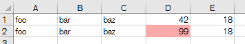 cells(2,1) = "foo" : cells(2,2) = "bar": cells(2,3) = "baz" : cells(2,4) = 99 : cells(2,5) = 18