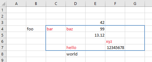 cells(1,1) = "foo" : cells(1,2) = "bar": cells(1,3) = "baz" : cells(1,4) = 42 : cells(1,5) = 18