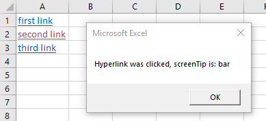 .hyperlinks.add anchor := .cells(3, 1), textToDisplay := "third link" , screenTip := "baz", address := ""