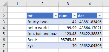 The following image shows the created list object. As can be seen, the dates are imported with the correct numbers (days since 1899-12-31), but not formatted correctly.