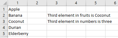 functions to get the ranges' third element. option explicit sub main() ' { dim nameFruits, nameNumbers as name cells(1,1) = "Apple" cells(2,1) = "Banana" cells(3,1) = "Coconut" cells(4,1) = "Durian" cells(5,1) = "Elderberry" set nameFruits = names.add("fruits", refersTo := range(cells(1,1), cells(5,1)) ) set nameNumbers = names.add("numbers", refersTo := array("one", "two", "three", "four") ) cells(2, 3).formula = "= ""Third element in fruits is "" & index(fruits , 3)" cells(3, 3).formula = "= ""Third element in numbers is "" & index(numbers, 3)" end sub ' }