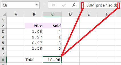 cells(8,3).formulaArray = "= sum(price * sold)"