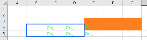 The following example first creates a 2-rows by 3 columns range (named rng_orig) and fills it with the green text orig.