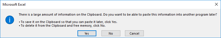 method, Excel might display a message that says There is a large amount of information on the clipboard. Do you want to be able to paste this information into another program later?: application.displayAlerts