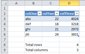 cells(8,2) = "Total rows" : cells(8, 4) = "=rows(tq84Tab)"