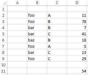 = SUMIFS( $D$2:$D$9 , $B$2:$B$9 , "bar" , $C$2:$C$9 , "C")