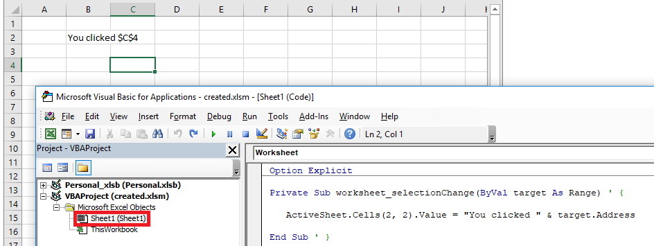 option explicit private sub worksheet_selectionChange(byVal target as range) ' { activeSheet.cells(2, 2).value = "You clicked " & target.address end sub ' }