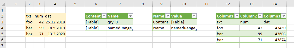 workbook's tables, named ranges and dynamic arrays are stored in nested tables.