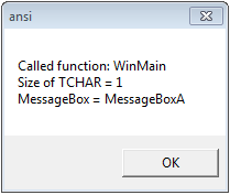 The program itself is rather simple: it shows a message box that reveals which entry point was used and what the size of a TCHAR