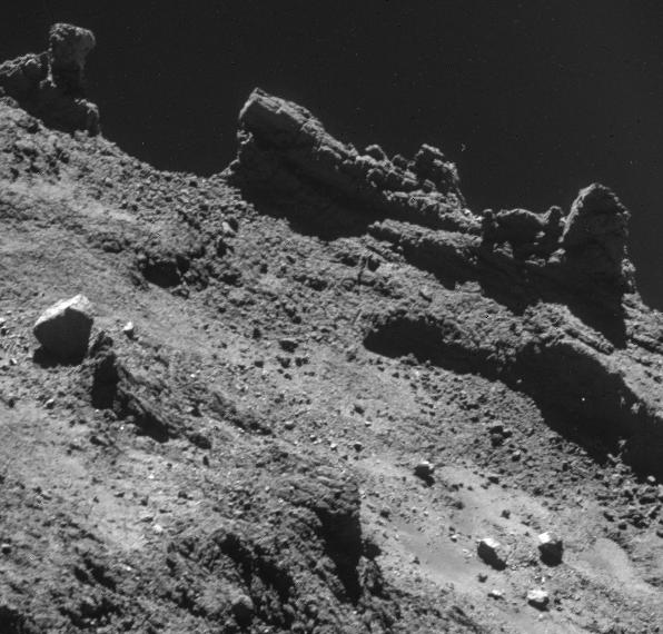In der Region Aker des Kometen 67P stehen drei Gesteinsbrocken. Der grösste hat eine Ausdehnung von ca 45 Metern.