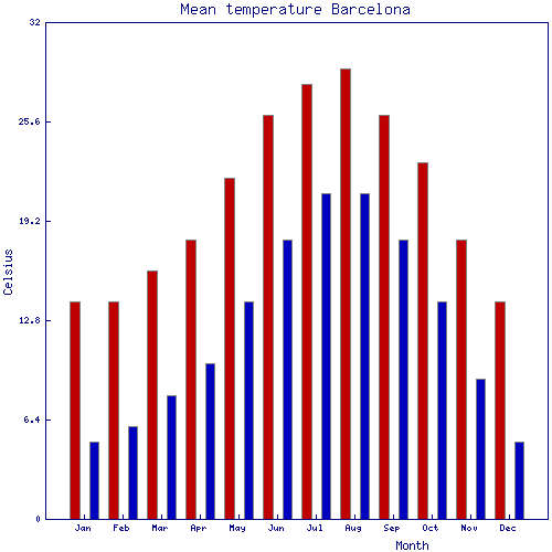 [ 14, 14, 16, 18, 22, 26, 28, 29, 26, 23, 18, 14 ], # Mean Max Temperature Barcelona