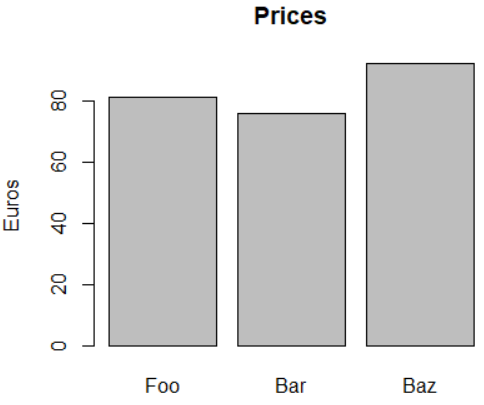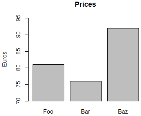 barplot(prices, main='Prices', ylab='Euros', ylim=c(70, 95), xpd=FALSE) # xpd: Should bars be allowed to go outside region?