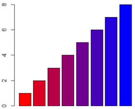 to display these: paletteFunc <- colorRampPalette(c('red', 'blue')); palette <- paletteFunc(8); barplot(1:8, col=palette);