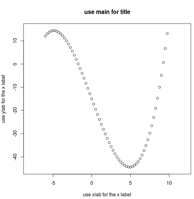 x11() x <- seq(-6, 10, by=0.25) # c(-6:10) y <- x*x*x/8 - 9*x -15 x11() plot(x, y, main="use main for title" , xlab="use xlab for the x label", ylab="use ylab for the x label", xlim=c(-8,12) , ylim=c(-45,15) , ) z <- locator(1) # wait for mouse click or enter pressed