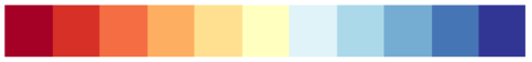 library(RColorBrewer) library(raster) palette = brewer.pal(11,'RdYlBu'); grid <- raster(ncols=11, nrows = 1, xmn=1, xmx=11, ymn=1,ymx=2); values(grid) <- 1:11 par(mar=rep(0.5, 4)) plot(grid, col=palette, legend=FALSE, axes = 0, box=FALSE)