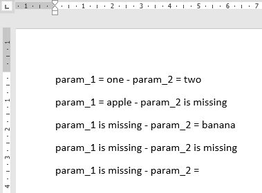 or not explicitly stating a value. option explicit sub main() ' { call xyz("one", "two") call xyz("apple") call xyz(param_2 := "banana") call xyz call xyz(param_2 := null) activeDocument.saved = true end sub ' } ' xyz { private sub xyz ( _ optional param_1 as variant, _ optional param_2 as variant _ ) if isMissing(param_1) then selection.typeText("param_1 is missing") else selection.typeText("param_1 = " & param_1) end if if isMissing(param_2) then selection.typeText(" - param_2 is missing") else selection.typeText(" - param_2 = " & param_2) end if selection.typeText chr(13) end sub ' }