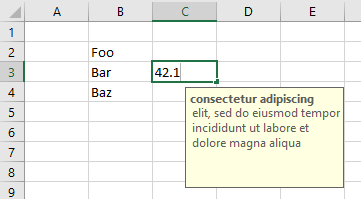cells(3,2) = "Bar" : excelRangeToolTip cells(3,3), "consectetur adipiscing", "elit, sed do eiusmod tempor incididunt ut labore et dolore magna aliqua"