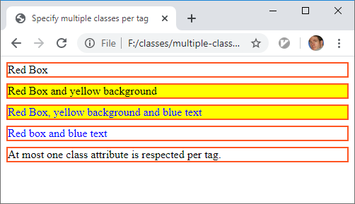 <div class='red_box' class='blue_text' >At most one class attribute is respected per tag.</div>