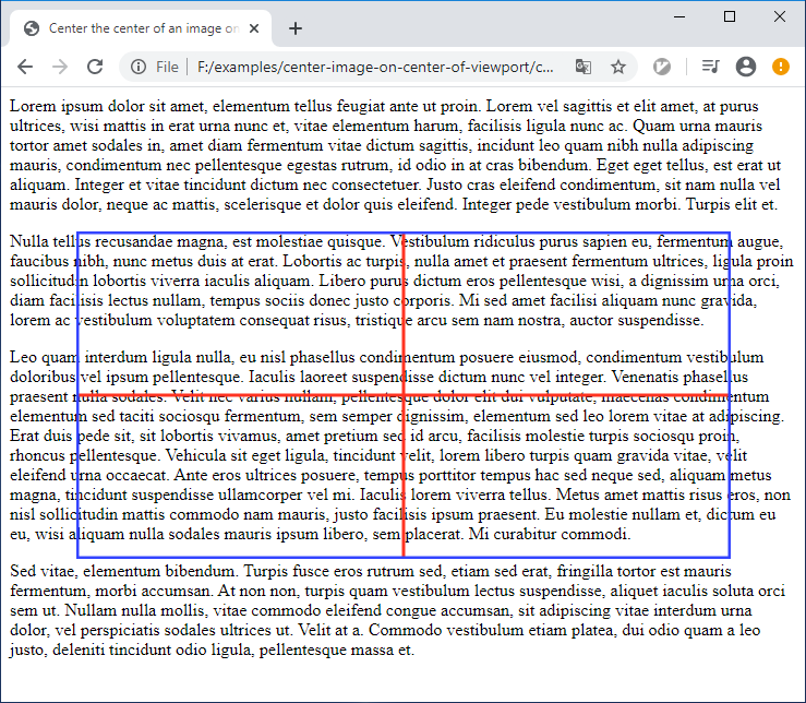 The dimension of the image is not too large: 600 pixels by 300 pixels. It consists of a blue border at the image's edges and two red lines that indicate the location of the center of the image.