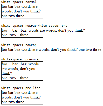 <div style="white-space: pre;border: 1px solid black;width:10em">foo bar baz words are words, don't you think?