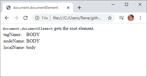 <!DOCTYPE html> <html> <head> <meta content="text/html;charset=utf-8" http-equiv="Content-Type"> <title>document.body</title> <script type="text/JavaScript"> function main() { try { var bodyElement = document.body; var table = document.getElementById('table'); var rows = table.rows; for (var r=0; r<rows.length; r++) { var cells = rows[r].cells; var key = cells[0].innerHTML; cells[0].innerHTML = key + ':'; cells[1].innerHTML = bodyElement[key]; } } catch(e) {alert (e);} } </script> </head> <body onload='main();'> <code>document.documentElement</code> gets the root element. <table id='table'> <tr><td>tagName</td><td></td></tr> <tr><td>nodeName</td><td></td></tr> <tr><td>localName</td><td></td></tr> </table> </body> </html>