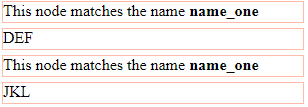 property. <!DOCTYPE html> <html> <head> <meta content="text/html;charset=utf-8" http-equiv="Content-Type"> <title>document.getElementsByName</title> <style type="text/css"> div { height: 20px; width: 300px; margin: 5px; border: #ffbbaa 1px solid; } </style> <script type="text/javascript"> function main() { try { var node_list = document.getElementsByName('name_one'); for (var i = 0; i<node_list.length; i++) { node_list[i].innerHTML = "This node matches the name <b>name_one</b>"; }; } catch(e) {alert (e);} } </script> </head> <body onload='main();'> <div name="name_one">ABC</div> <div name="name_two">DEF</div> <div name="name_one">GHI</div> <div name="name_two">JKL</div> </body> </html>