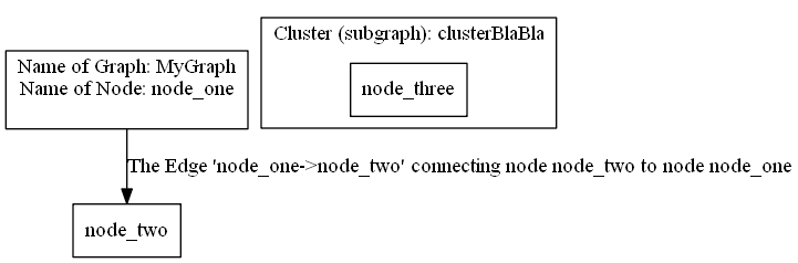 the name of the tail node in an edge digraph MyGraph { node [shape=box]; node_one [ label="Name of Graph: \G\nName of Node: \N\n " ] node_two; node_one -> node_two [label="The Edge '\E' connecting node \H to node \T"] subgraph clusterBlaBla { label="Cluster (subgraph): \G"; node_three; }; }