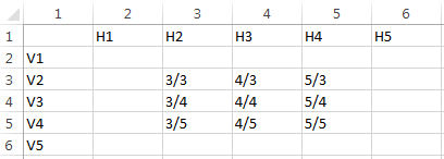 range(cells(3,3), cells(5,5)).formulaArray = "={ ""3/3"",""4/3"",""5/3"" ; ""3/4"",""4/4"",""5/4"" ; ""3/5"",""4/5"",""5/5"" }"