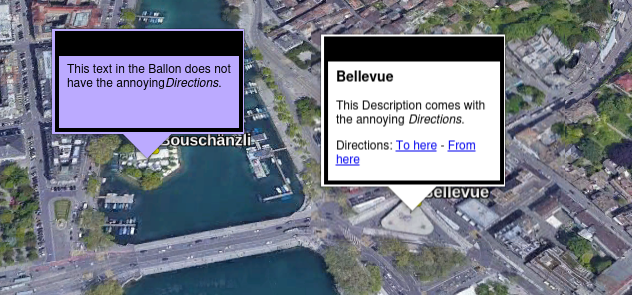 When using a <description> with a <BalloonStyle>, the annoying Direction link can be removed.